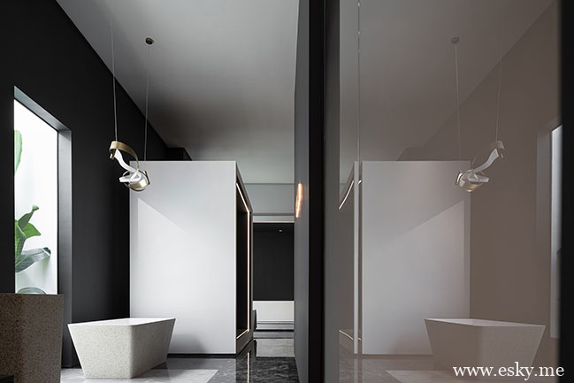 光是空间中不可缺少的元素。浴室是最私人的地方,也是冥想的场所。设计师们没有将窗户与外部直接连接起来,而是为每个空间分别竖立了一个封闭的庭院,只留下院子上方的开口。院子里种着像香蕉树这样的绿色植物,增添了一种神秘而富有诗意的氛围。当自然光线透过香蕉叶照射到房间时,这个空间就变得活跃起来。整个流通路线采用开放式布局,让人们在里面行走时能有更流畅舒适的体验。墙壁上被植物分割的阴影产生了与中庭不同的视觉效果,突出了光线的优雅。可见光和不可见光以不同的方式在建筑物之间穿梭,在建筑物的表面或内部留下标记。